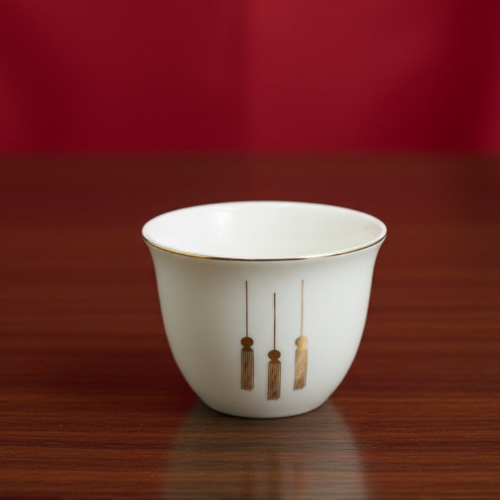 The 5848G Cawa Cup 12-Piece Set brings together traditional Arabian grace and modern artistry. Each cup features a sleek white ceramic body delicately accented with a gold tassel motif — symbolizing celebration and refined hospitality. The fine gold rim adds a touch of luxury, creating a perfectly balanced design that complements every Arabic coffee moment.