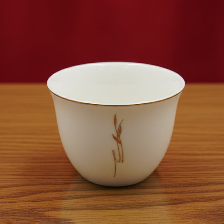 The 5849G Cawa Cup 12-Piece Set showcases minimalistic luxury inspired by the essence of Arabian hospitality. Each cup is beautifully crafted from fine ceramic and detailed with a sleek golden leaf line that symbolizes simplicity and grace. The lustrous white glaze, complemented by a fine gold rim, gives each piece a timeless, refined charm.