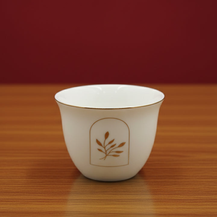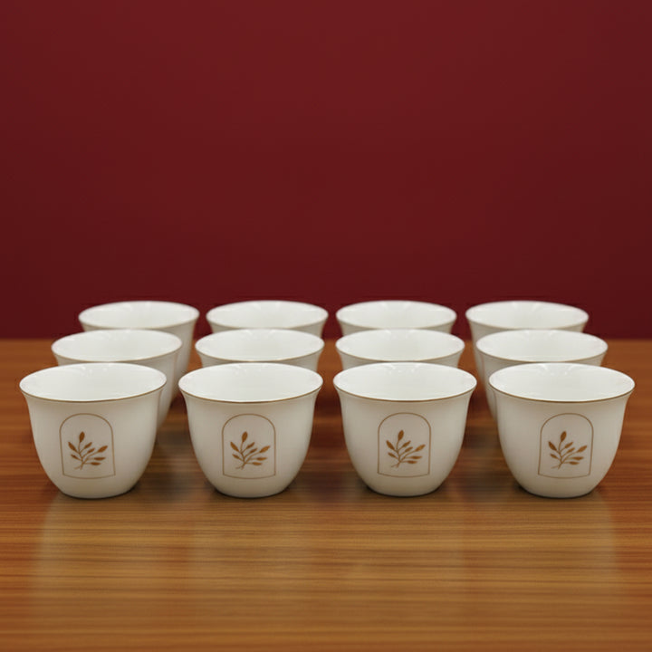 The 5866G Cawa Cup 12-Piece Set captures the charm of traditional Arabian hospitality with a touch of refined modernity. Each cup is beautifully crafted from premium ceramic and adorned with a delicate gold leaf motif enclosed in an elegant arch frame. The subtle combination of white glaze and fine gold rim creates a sophisticated look that radiates grace and luxury.