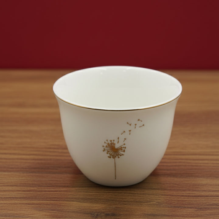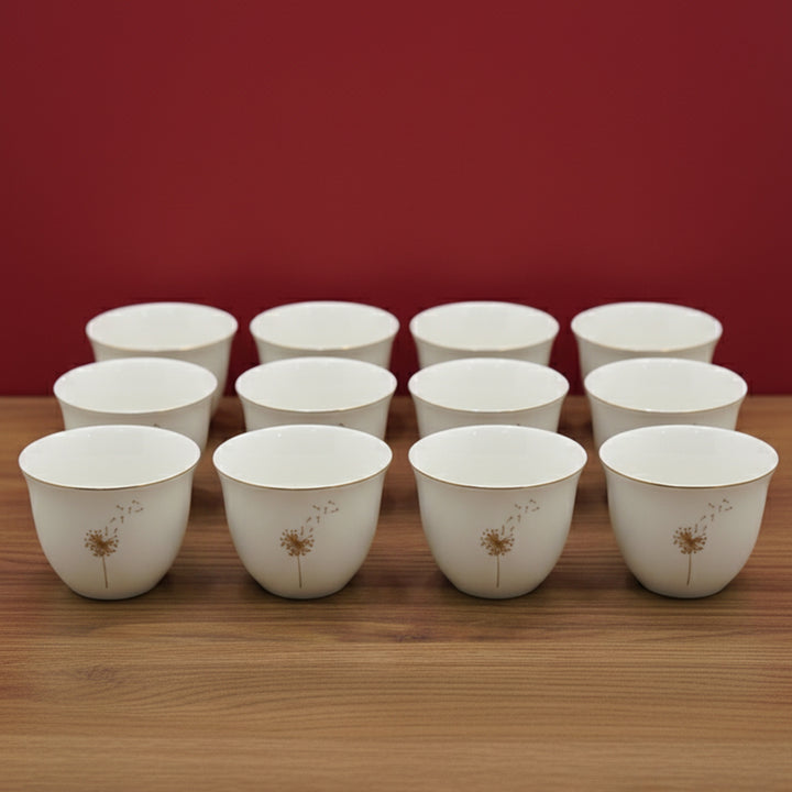 The 5853G Cawa Cup 12-Piece Set features a beautifully serene design that captures the essence of grace and tranquility. Each cup is crafted from fine white ceramic and adorned with a delicate gold dandelion motif, symbolizing wishes and gentle beauty. The elegant gold rim adds a subtle luxury touch, making every coffee moment a refined experience.