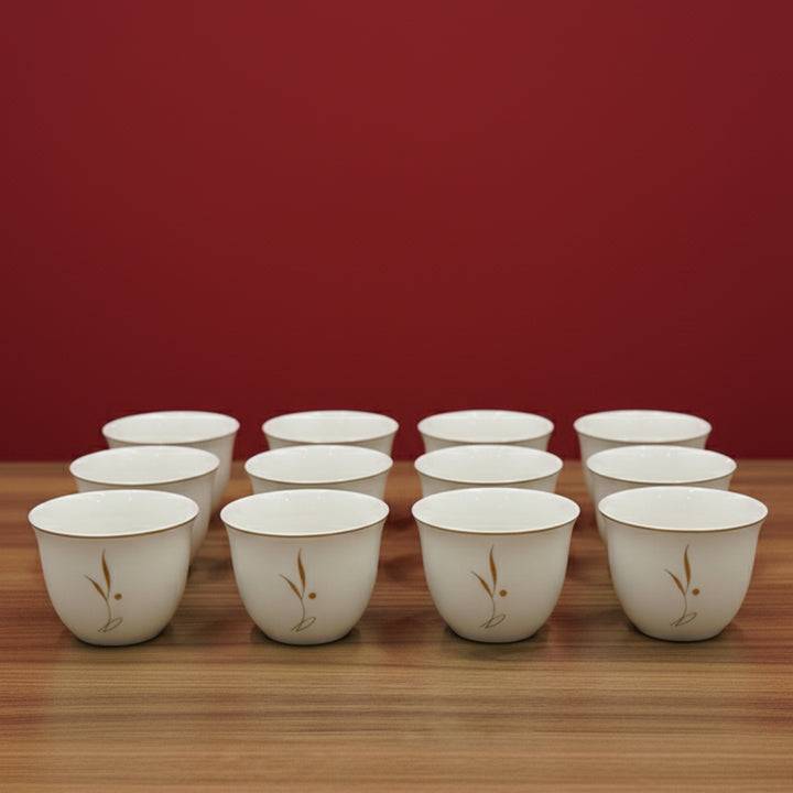 The 5858G Cawa Cup 12-Piece Set is a refined blend of modern simplicity and classic grace. Each cup is crafted from premium-quality ceramic and elegantly detailed with a delicate gold leaf curve and subtle dot accent — a design that symbolizes balance, beauty, and sophistication. The glossy white finish and gold-edged rim complete the look, offering a timeless touch of luxury to your coffee moments.