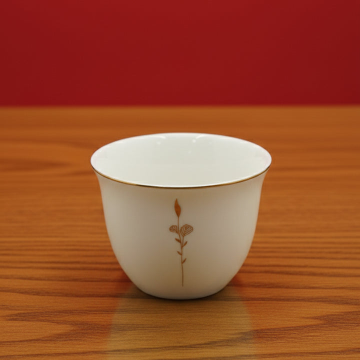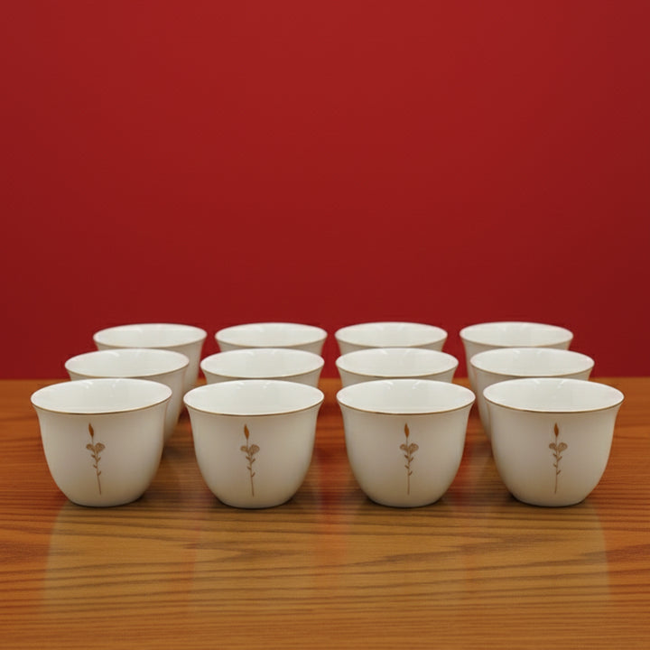 The 5861G Cawa Cup 12-Piece Set captures the timeless charm of Arabian hospitality through its delicate floral gold motif and graceful white ceramic finish. Each cup is adorned with a fine gold rim and a minimal yet refined flower design, symbolizing beauty and warmth with every serving of Arabic coffee.