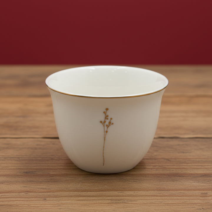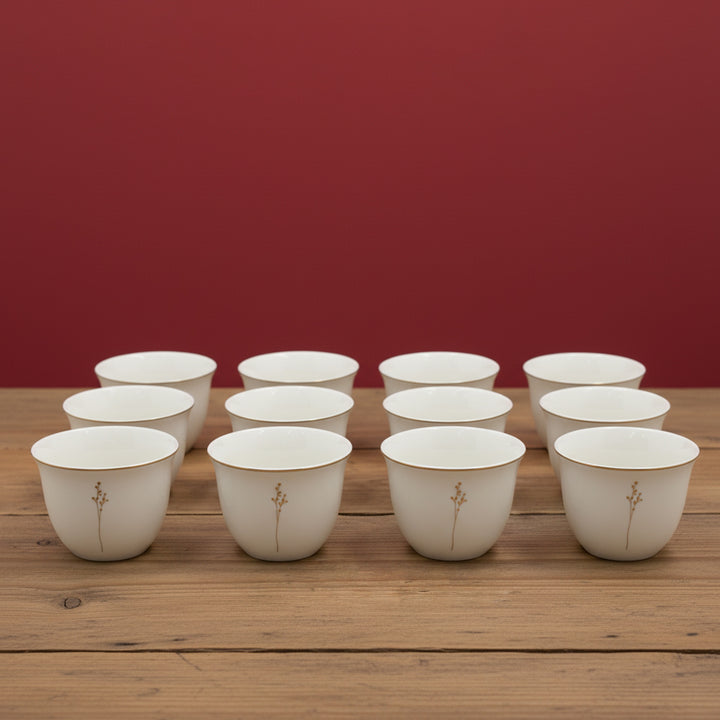 The 5863G Cawa Cup 12-Piece Set embodies timeless elegance and understated beauty. Each cup is meticulously crafted from fine ceramic and delicately adorned with a slender gold floral line — a minimalist design that reflects refinement and purity. The smooth ivory-white glaze paired with a subtle gold rim adds an exquisite finishing touch that elevates every coffee serving moment.