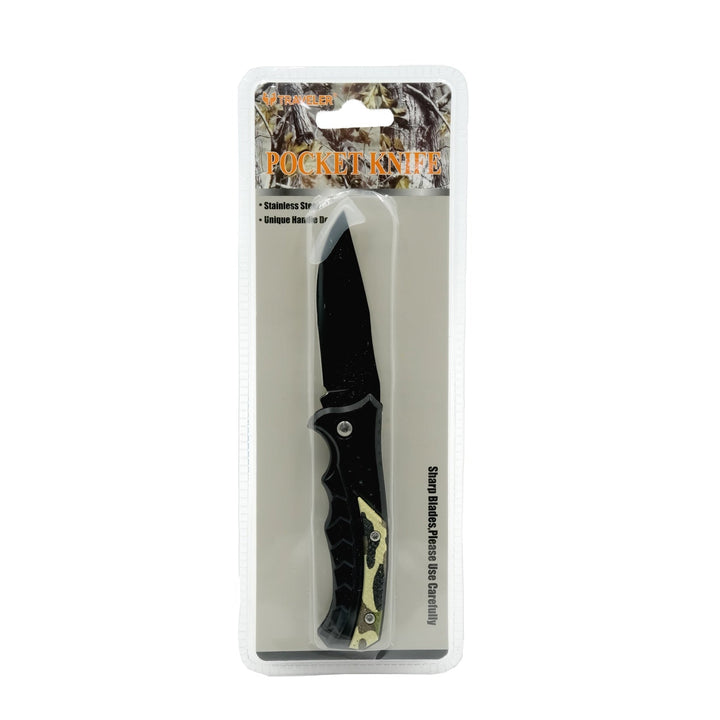 The AMD3444 Pocket Knife – Stainless Steel Folding Knife with Gold Accent Handle – Black offers durability and style in one compact tool. Featuring a sharp stainless steel blade and an ergonomic handle with gold accents, this knife is perfect for outdoor tasks, travel, or everyday use.