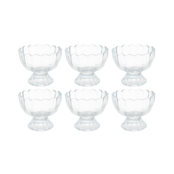 Serve your favorite desserts in style with the BQL008-2 Ice Cream Bowl Set. This 6-piece set is crafted from high-quality clear glass, featuring a classic scalloped design that adds a touch of elegance to any table. Perfect for ice cream, puddings, fruit salads, and more, these bowls are ideal for both everyday use and special occasions.