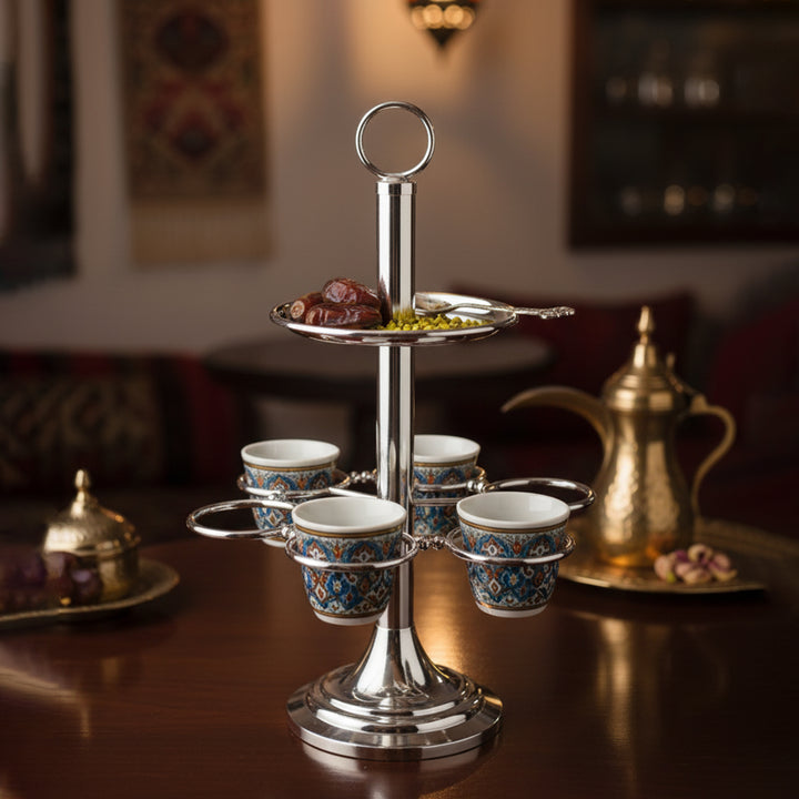 The CD-7255 Cawa Cup Holder (Silver Finish – 6 Ring Design) is a beautifully crafted piece that combines functionality with timeless elegance. Featuring six individual ring holders, it securely displays your cawa cups in a graceful arrangement — perfect for serving or decorative presentation.