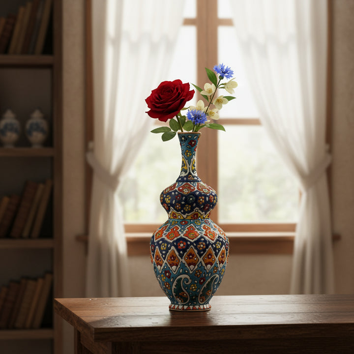 The Ceramic Handmade Flower Vase S – Decorative Hand-Painted Floral Design is a stunning example of miniature artistry and traditional ceramic craft. Expertly handmade by skilled artisans, this small vase features a distinctive double-curved shape adorned with intricate floral and geometric motifs. Each pattern is individually hand-painted in vibrant multicolor tones, creating a rich and textured surface that exudes cultural elegance. Ideal for tabletops, shelves, or accent corners, this vase serves as both a functional flower holder and a decorative showpiece that adds warmth and color to any space.