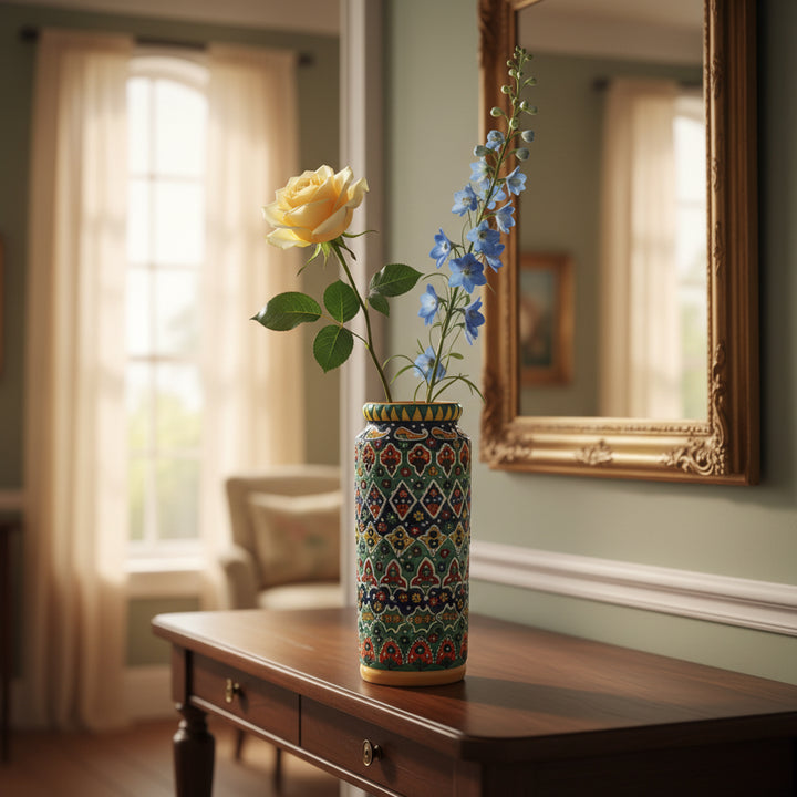 The Ceramic Handmade Flower Vase XL – Decorative Hand-Painted Floral Design is a stunning showcase of traditional ceramic artistry and refined elegance. Expertly handcrafted by skilled artisans, this tall cylindrical vase features intricate hand-painted floral and geometric motifs in rich, vibrant tones. Its glossy glazed finish and textured detailing highlight the precision and care that go into each piece. Designed to make a statement, this XL vase is perfect for holding long-stemmed flowers, decorative branches, or serving as a bold standalone accent in any interior space.