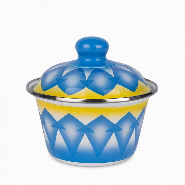 The DBF20 Enamel Serving Bowl with Lid – 20 cm – Blue & Yellow Geometric Design showcases a perfect blend of vibrant style and everyday functionality. Crafted from premium enamel-coated steel, this spacious serving bowl features a striking geometric pattern in blue and yellow that adds a cheerful touch to any table setting. Ideal for serving rice, salads, soups, or desserts, it combines durability, elegance, and practicality for both daily meals and special gatherings.