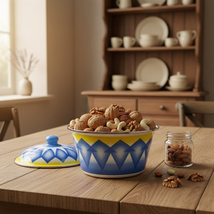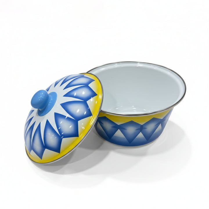 The DBF24 Enamel Serving Bowl with Lid – 24 cm – Blue & Yellow Geometric Design combines vibrant artistry with premium quality craftsmanship. Made from high-grade enamel-coated steel, this large serving bowl is ideal for family dinners, festive gatherings, or buffet-style serving. Its striking geometric pattern in blue and yellow adds a cheerful and modern accent to your dining table, while the durable enamel finish ensures long-lasting performance and easy maintenance.