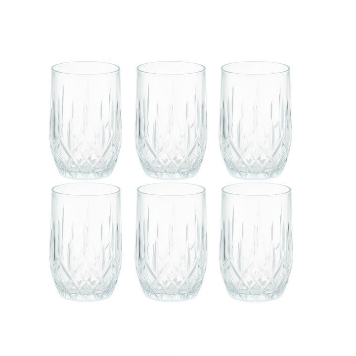 Serve your favorite beverages in style with the DSKB502-2C Glass Tumbler Set. Featuring a tall, crystal-cut design, this 6-piece set adds a touch of sophistication to your dining experience. Perfect for water, juice, mocktails, or cocktails, these tumblers combine durability with a premium look, making them a must-have for both casual and formal settings.