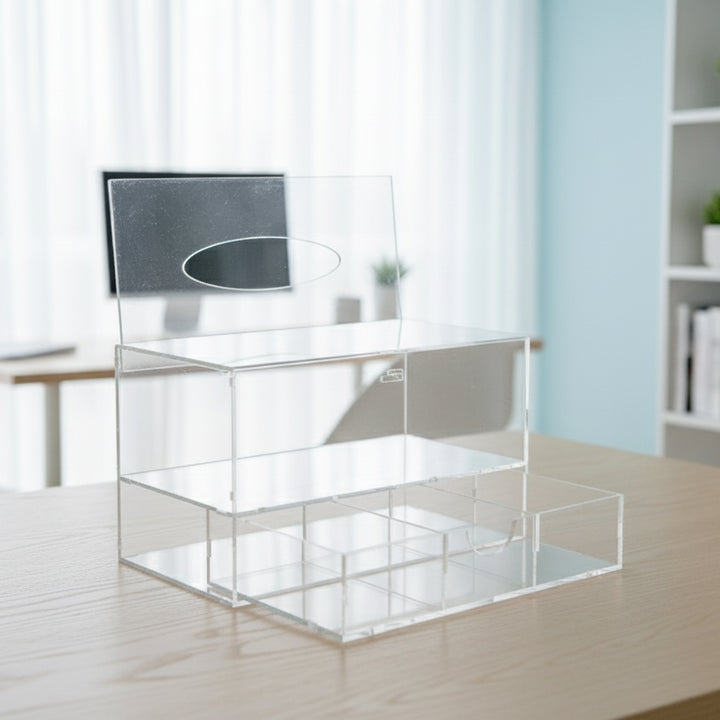 The EA-BX255 Acrylic Tissue Box is a stylish and practical storage solution for your home or office. Made from premium transparent acrylic, it features a top tissue slot and multiple compartments for organized storage of small items. Perfect for use on dressing tables, desks, or countertops, this design combines beauty, durability, and everyday functionality.