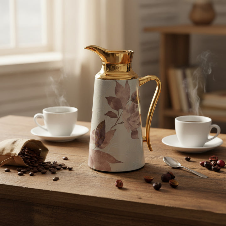 The HJ1413 Marisella Vacuum Flask – 1L – Red & Gold Floral Design adds a warm, luxurious feel to your serving collection. The rich red floral artwork paired with striking gold accents creates a premium look perfect for festive gatherings, family hosting, and daily use. With strong heat retention and a smooth pouring experience, this flask is made for serving Arabic tea, coffee, and hot drinks with style.