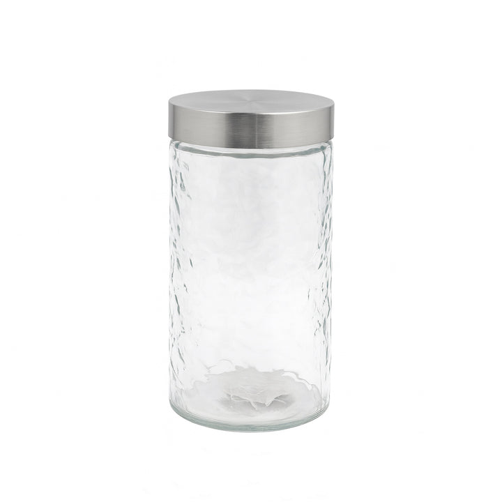Keep your kitchen essentials fresh and organized with the HMK20190 Glass Storage Jar with Metal Lid – 1700 ml. Featuring a tall cylindrical design with a textured hammered-glass finish, this jar adds a touch of sophistication to your pantry or countertop. The secure metal screw-on lid helps lock in freshness, making it perfect for bulk storage of rice, pasta, cereals, or cookies.