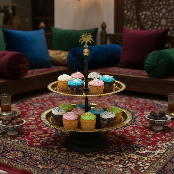 The MAC102BG Cake Stand combines two polished gold-finish serving plates with a beautifully crafted centre rod topped with a palm-tree finial, creating a luxurious Arabian-inspired display piece.