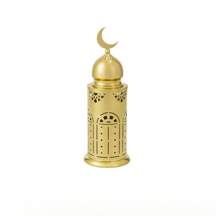• Design: Cylindrical lantern with gold dome top, crescent moon finial, detailed window and geometric cut-outs