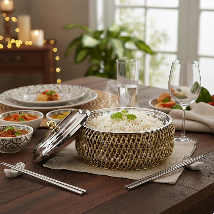 Serve in style with the MD-1092A Food Server — a luxurious blend of practicality and elegance. Made from premium stainless steel, this 3-liter server features a polished silver lid paired with a golden diamond-weave base for a rich, modern look. Ideal for keeping dishes warm and presenting food beautifully at family dinners or festive occasions.