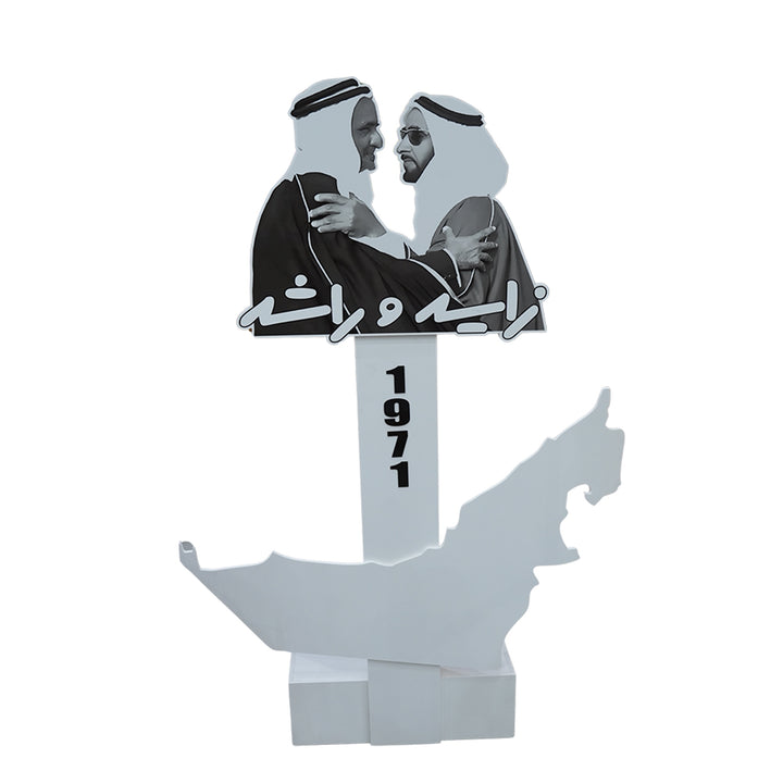 The NATIONAL00038 UAE National Day Forex Stand – Zayed & Rashid Founding Leaders Panel is a powerful decorative piece celebrating the historic unity between Sheikh Zayed bin Sultan Al Nahyan and Sheikh Rashid bin Saeed Al Maktoum. Featuring a bold black-and-white portrait of the two leaders embracing, along with the year 1971 and a cut-out map of the UAE, this stand captures the true spirit of union and national pride.