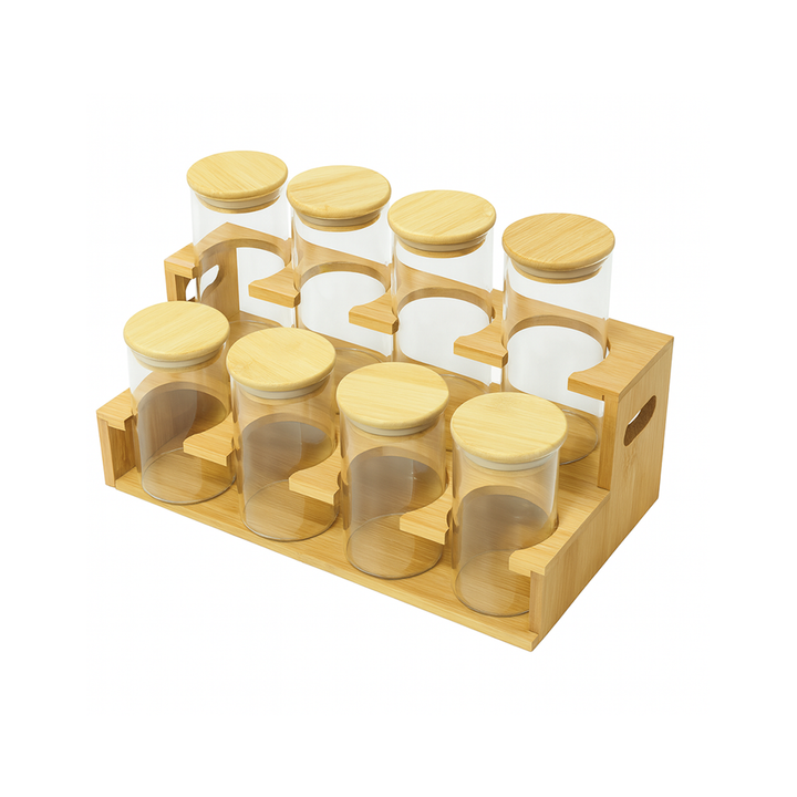 • Design: 4 jars on the upper row + 4 jars on the lower row arranged on a two-tier bamboo rack