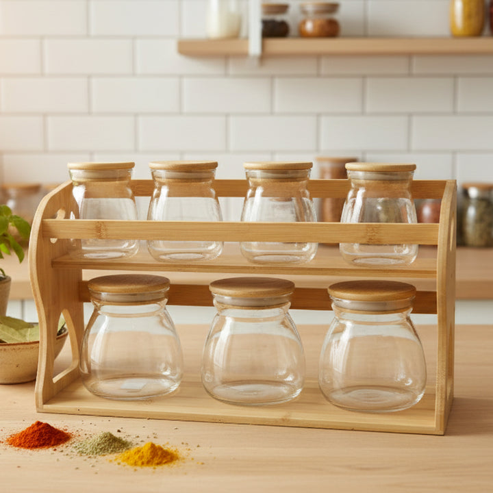 - Set Includes: 7 sealed jars + 1 bamboo rack