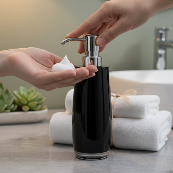 The NT-30070-1 Hand Wash Bottle offers a stylish and functional solution for everyday use. Designed with a glossy black slim tall body and a shiny chrome pump, it adds a modern and polished touch to bathrooms, kitchens, or office wash areas. Perfect for dispensing hand wash, lotion, or sanitizer, this bottle combines elegance with practicality.
