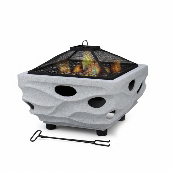 - Material: Heat-resistant stone-effect body with durable metal fire bowl