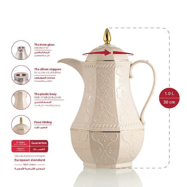 The RS-624 Rose Vacuum Flask – 1.0L Coffee Server brings timeless elegance and exceptional performance to your table. Designed with a high-grade plastic body and an asbestos-free inner glass liner, it ensures your beverages remain hot or cold for hours while preserving their authentic flavor. The brown beige finish with golden accents and embossed floral detailing make it a sophisticated addition to any setting — ideal for serving Arabic coffee, tea, or milk in homes, offices, or majlis gatherings.