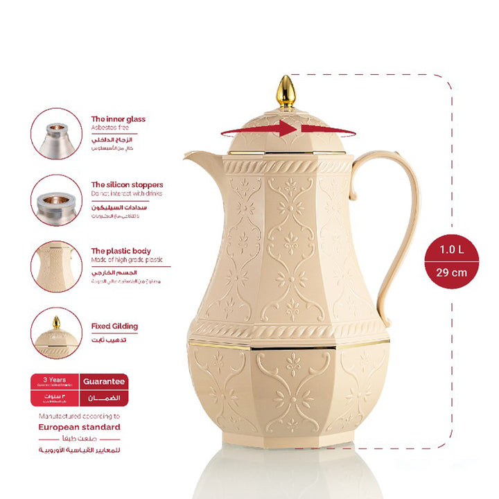 The RS-624 Rose Vacuum Flask – 1.0L Tea Server combines timeless Middle Eastern elegance with long-lasting thermal performance. Designed with a high-grade plastic body and an asbestos-free inner glass liner, it keeps your beverages hot or cold for hours while maintaining their pure taste and aroma.