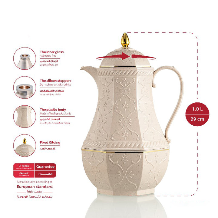 The RS-624 Rose Vacuum Flask – 1.0L Tea Server combines timeless design with reliable performance. Crafted with a high-grade plastic exterior and an asbestos-free inner glass liner, this flask keeps your beverages hot or cold for long hours without affecting flavor or aroma. The brown beige finish with golden accents and embossed floral detailing bring an elegant charm to your serving moments — perfect for Arabic tea, coffee, or milk during home gatherings, Ramadan evenings, or office hospitality.