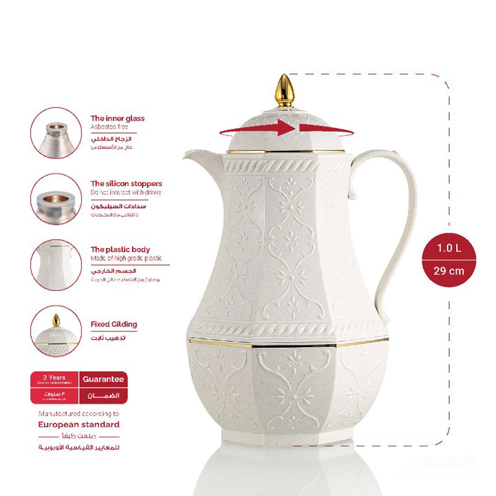 Featuring a white finish with golden accents and a delicate embossed floral pattern, it adds sophistication to any setting — perfect for serving Arabic tea, coffee, or milk in homes, offices, or majlis gatherings.