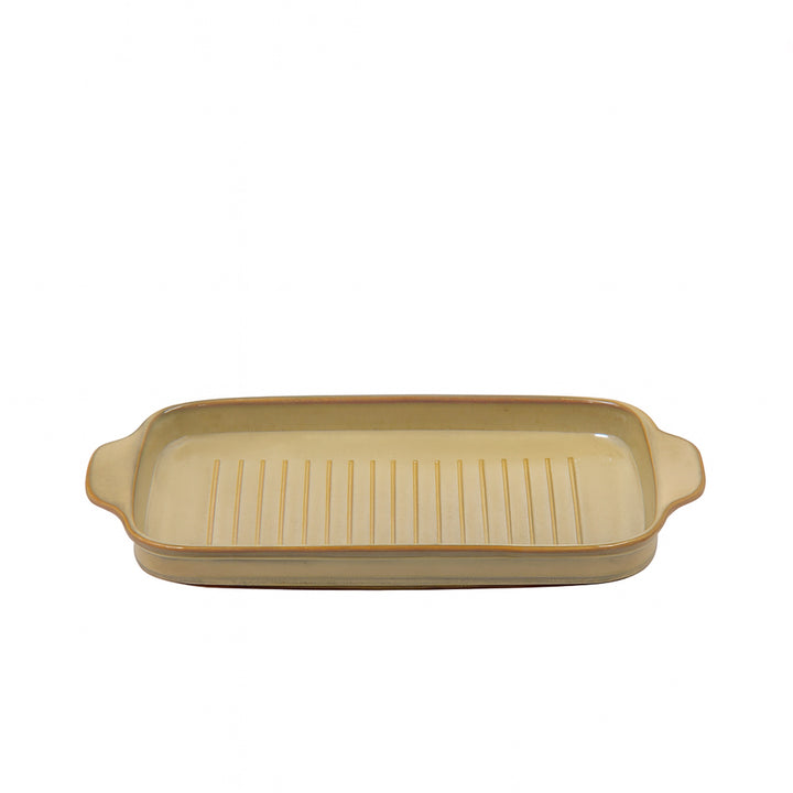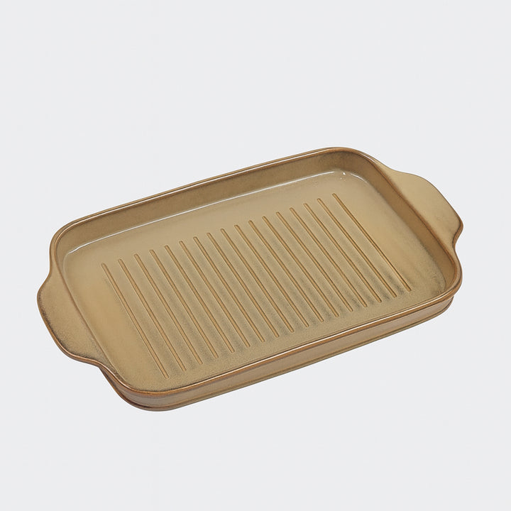 The SC3699 Porcelain Plate is a versatile and stylish addition to your serveware collection. Measuring 12.2 inches, this rectangular oven-safe plate is perfect for baking, grilling, and serving. Crafted from durable porcelain with a sleek glossy beige finish, it features convenient side handles and a ribbed surface that enhances both heat distribution and presentation. Ideal for main dishes, roasted meats, or appetizers, it seamlessly transitions from oven to table with elegance.