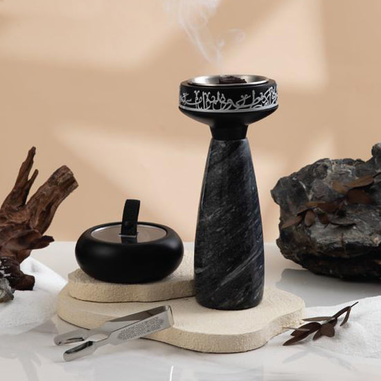 The YB0014 Athar Oud Burner – Black & Silver merges sleek marble elegance with Arabic artistry, creating a striking centerpiece for any space. Crafted from natural marble with a polished black body and detailed silver Arabic calligraphy around the metal rim, it reflects a refined fusion of tradition and luxury. Ideal for diffusing oud or bakhoor, this piece enhances every aromatic ritual with class and calm presence.