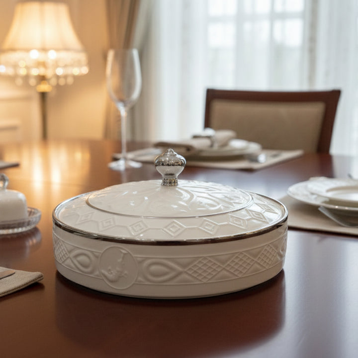 The YF405 Ceramic Bowl – White with Silver Lid – 25 cm (D) – Premium Serving Bowl combines elegance with practical functionality. Crafted from high-quality ceramic and finished with silver accents, this wide serving bowl adds a contemporary touch to any table setup. The embossed detailing and glossy finish make it ideal for both daily use and special occasions.